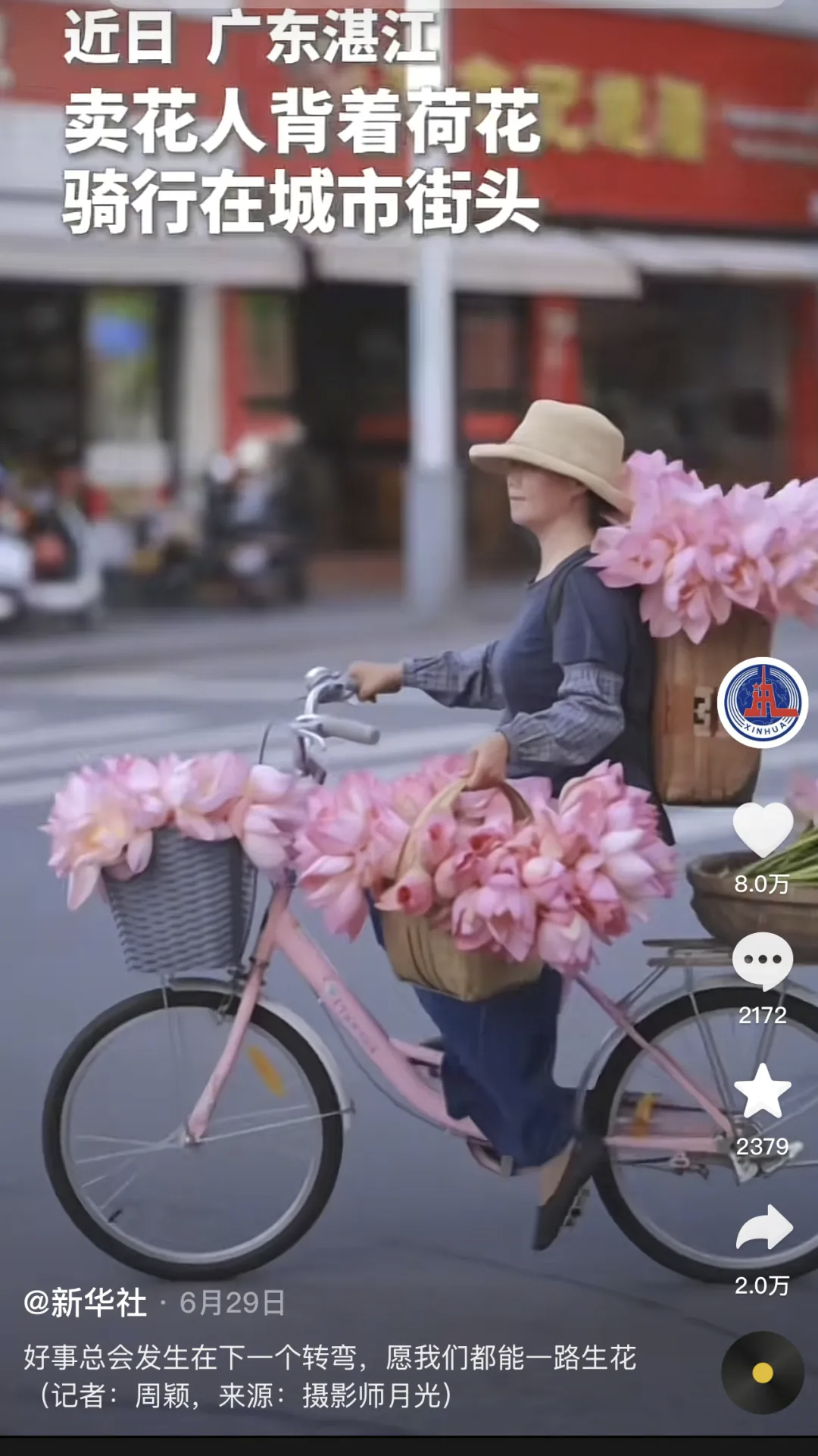2. 骑车送花,街头传递浪漫:达人将骑着自行车穿梭在武江山蕉村、江湾镇等街头村落,手捧鲜花随机赠予居民、游客。若在路上偶遇,打个招呼就有可能收获这份来自武江的惊喜。