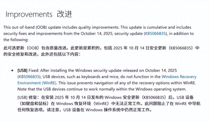 微软指出: “[USB]已修复:在安装了2025年10月14日发布的Windows安全更新 (KB5066835) 后,USB设备在Windows恢复环境 (WinRE) 中无法运行的问题。”